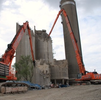 777 goliath Hitachi's make small work of Silos. 777 Group recently completed the safe demolition of six Silos at the Tate & Lyle site at Blackwall, London.